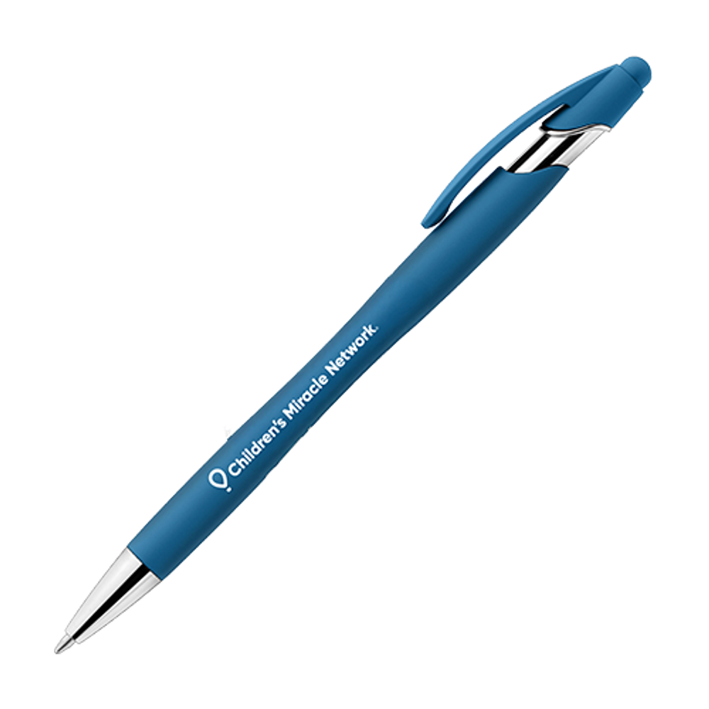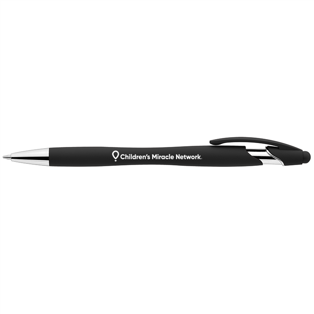 Experience the La Jolla Softy Pen with Stylus and fall in love. This sleek, elegant plastic pen uses trendy chrome trim and a bright finish that feels great and looks stunning. White logos pop against the eye-catching color range. This medium black ballpoint pen also features a matching stylus at the top, making this the perfect 2-in-1 advertising gift.