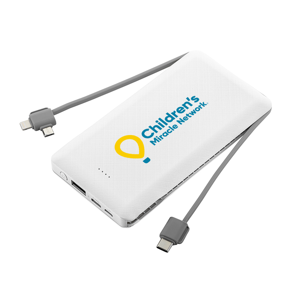 *Capacity: 10,000 mAh*Input: (Micro USB) 5V/2A*Input: (Type C) 5V/2A*Output: (Lightning cable) 5V/1A*Output: (Type C cable) 5V/2A*Output: (Micro USB cable) 5V/2A*Output: (USB): 5V/2.1A*Total output: 5V/2.1A